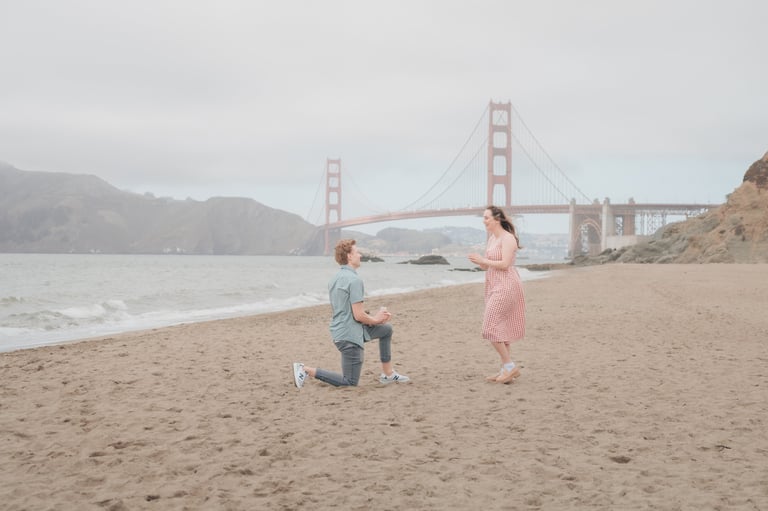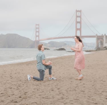 Before we even set foot on Baker Beach, Dano and I had mapped out the vision for the proposal. My role isn’t just to show up with a camera, but to make sure everything unfolds smoothly so you can stay in the moment. In our emails we talked about the best arrival time for golden light (if the fog behaved), how to position Kenna so she had the Golden Gate Bridge in the background, and even what to do if the beach was crowded.